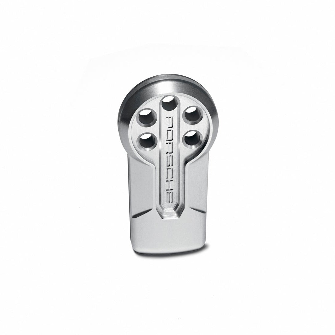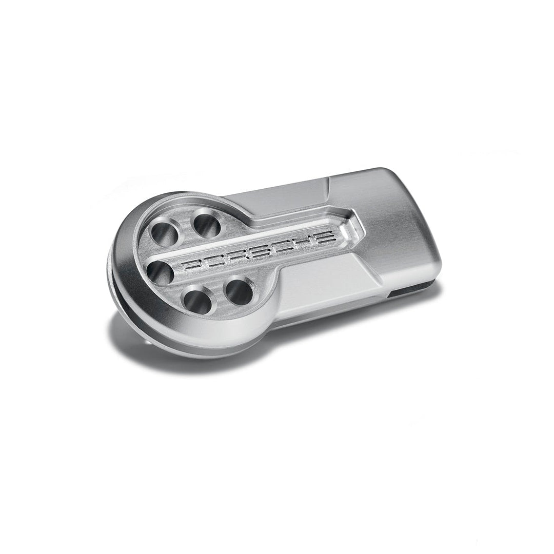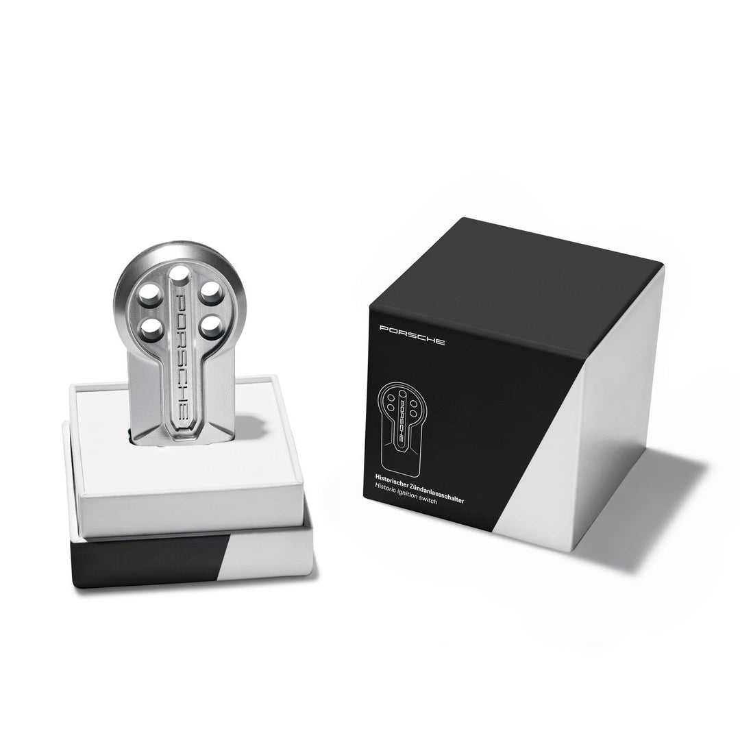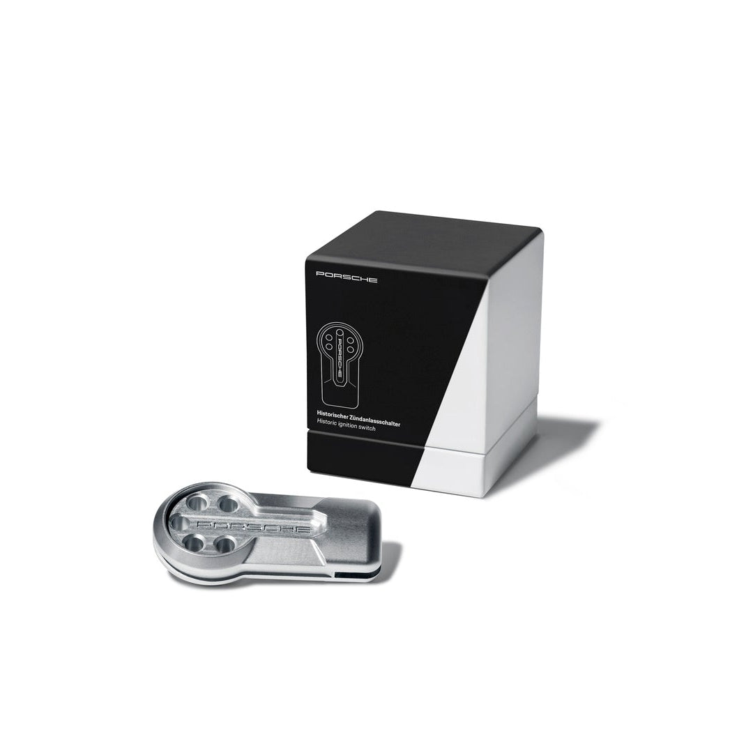 With the historic ignition starter switch, Porsche has developed a tribute to historic races and has set itself the task of preserving the Porsche tradition of the "ignition key on the left". It was designed together with Studio F.A. Porsche. Visually, it is reminiscent of the historic key head as used in the sports prototypes. For optimum stability and durability, it was milled from a single piece of aluminum. In order to protect the material, but also to recall the silver look of the aluminum bodies from the early days of Porsche motorsport, it was anodized in a clear finish. With 5 holes, finished with Porsche logos on both sides, the historic ignition starter switch brings a touch of racing history to the Porsche sports cars of today.