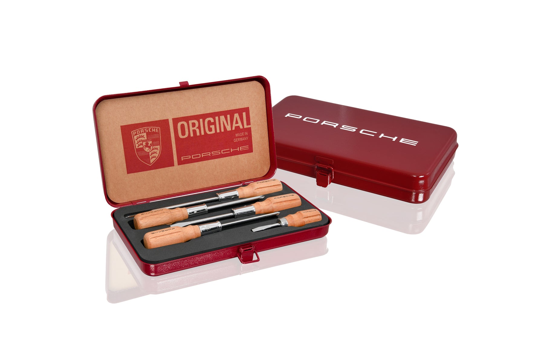 Reminiscent of the 1960s, this five-piece tool set from Porsche Classic comes in a classic look and contains a range of screwdrivers with a “PORSCHE” Logo on the wooden handles.
