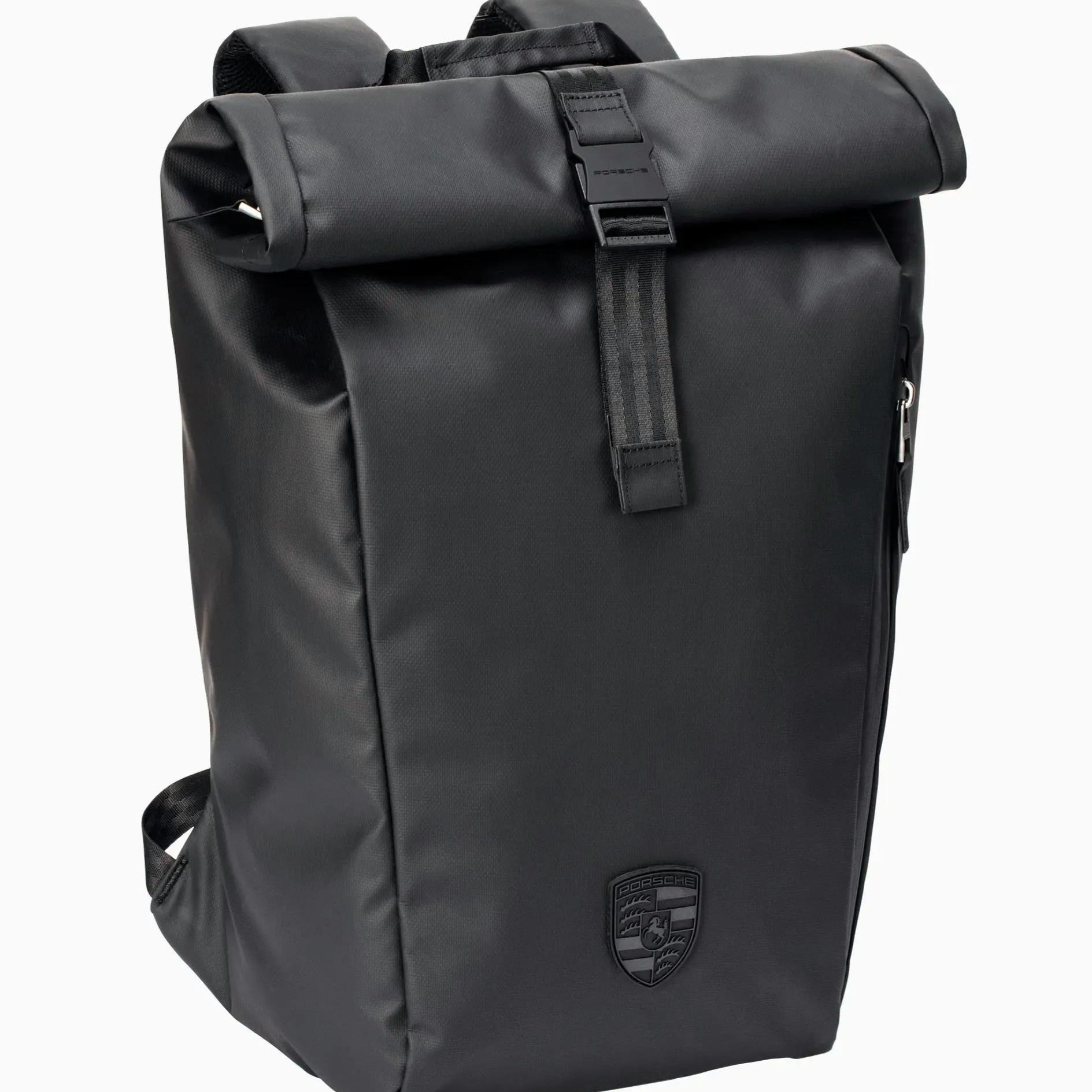 Hit the road in style: the Porsche Lifestyle roll-top backpack made of tarpaulin material combines design and function. The spacious main compartment with separate notebook compartment is ideal for those who like to work in nature. There is also a safe place for small essentials in the slot and zipped compartments. The padded mesh back and the adjustable and ergonomically shaped shoulder straps guarantee particularly a high level of comfort. The shiny 3D Porsche Crest on the front is an optical highlight. The exclusive look of the backpack is rounded off by details such as the '911' logo on the side and the reflective zip tape.