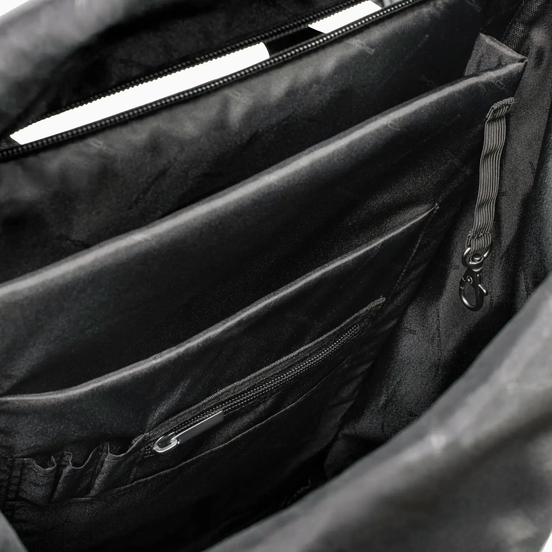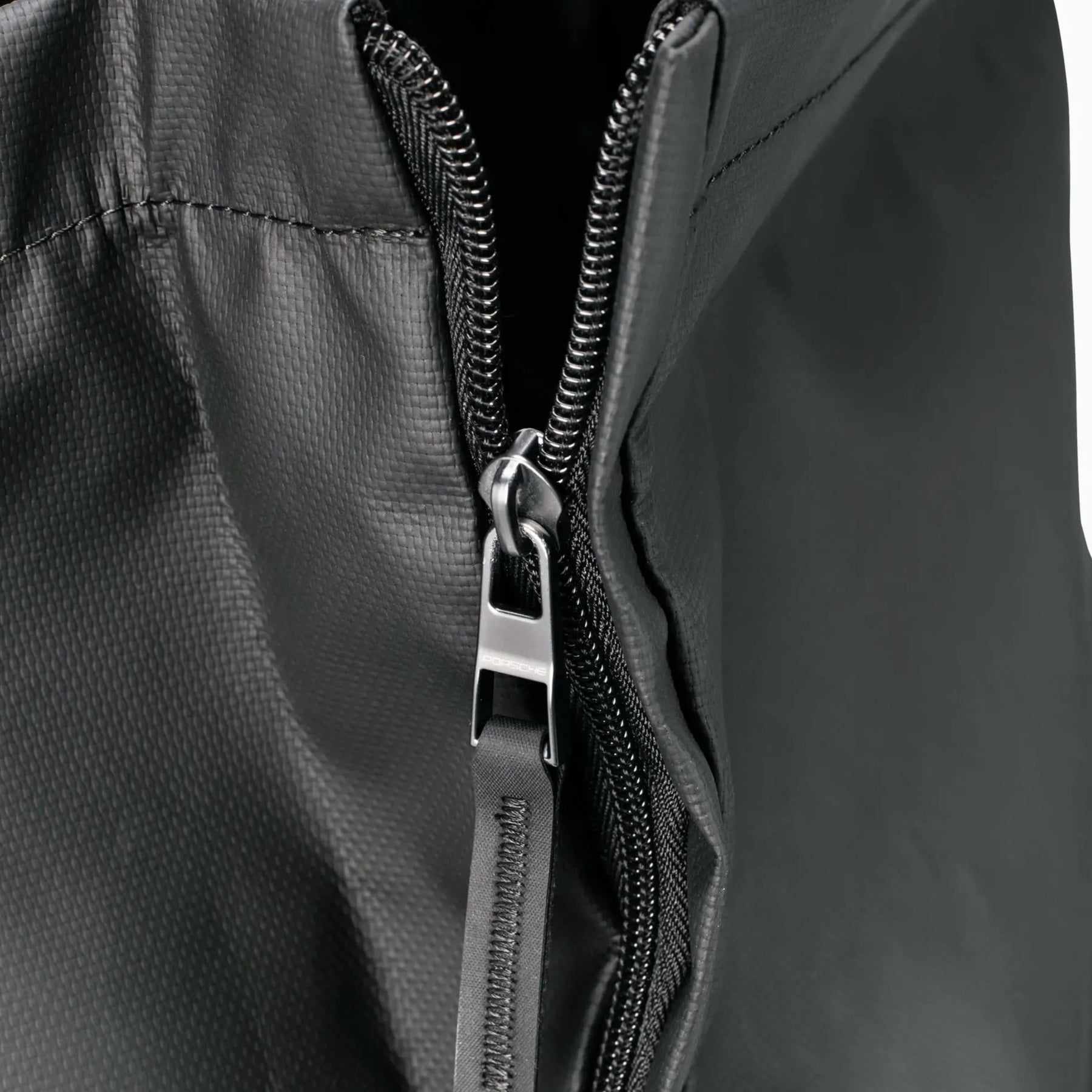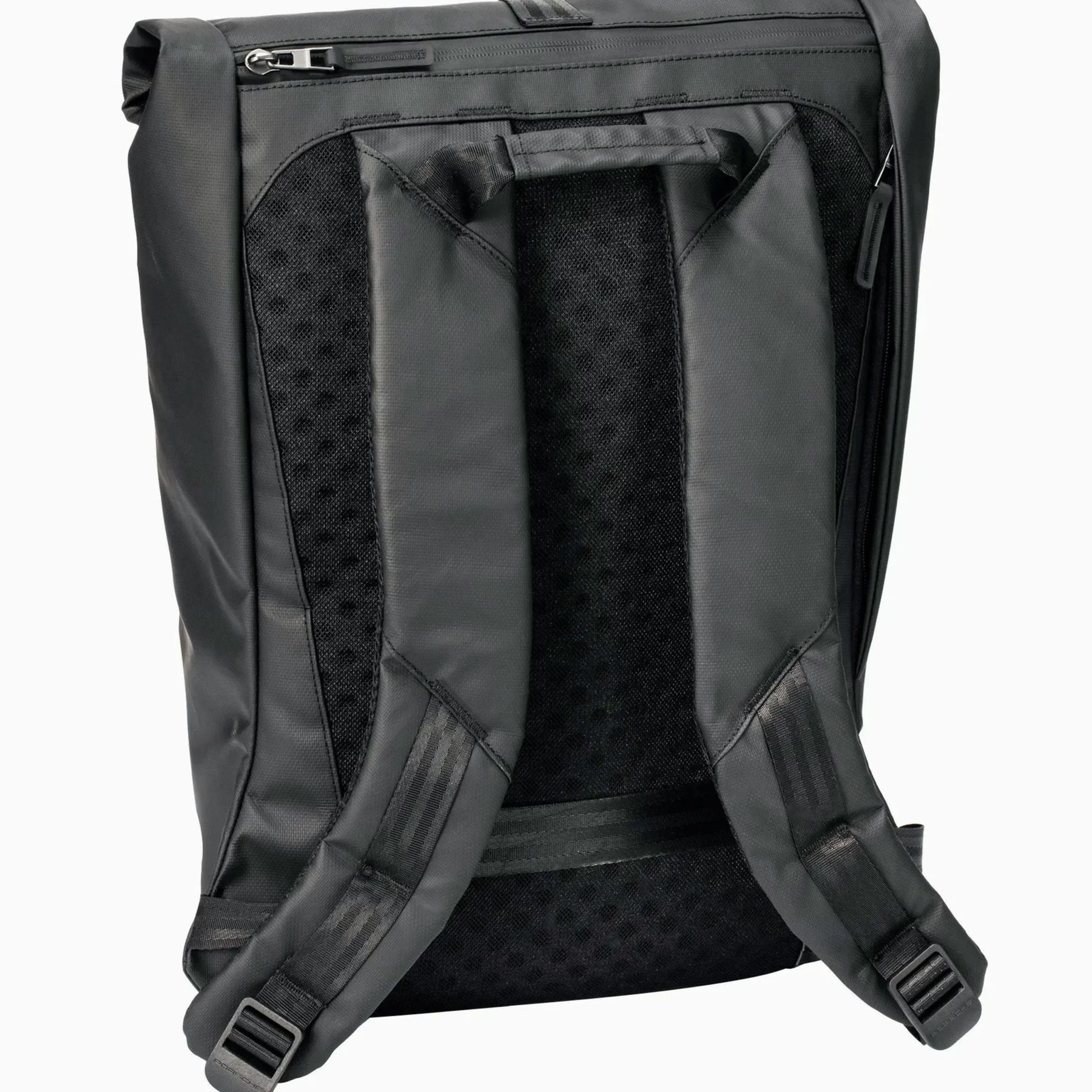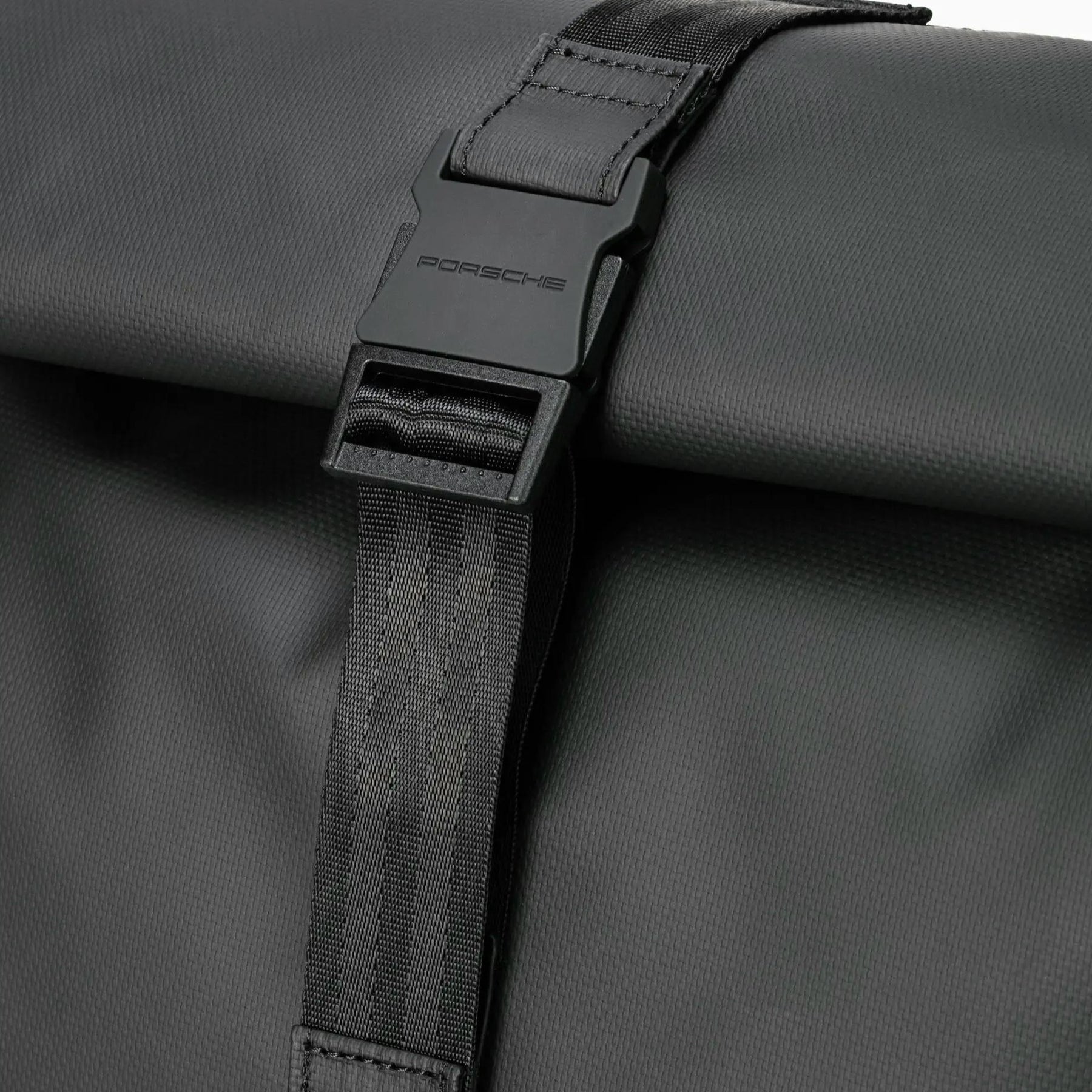 Hit the road in style: the Porsche Lifestyle roll-top backpack made of tarpaulin material combines design and function.The spacious main compartment with separate notebook compartment is ideal for those who like to work in nature. There is also a safe place for small essentials in the slot and zipped compartments. The padded mesh back and the adjustable and ergonomically shaped shoulder straps guarantee particularly a high level of comfort. The shiny 3D Porsche Crest on the front is an optical highlight. The exclusive look of the backpack is rounded off by details such as the 'Taycan' logo on the side and the reflective zip tape.