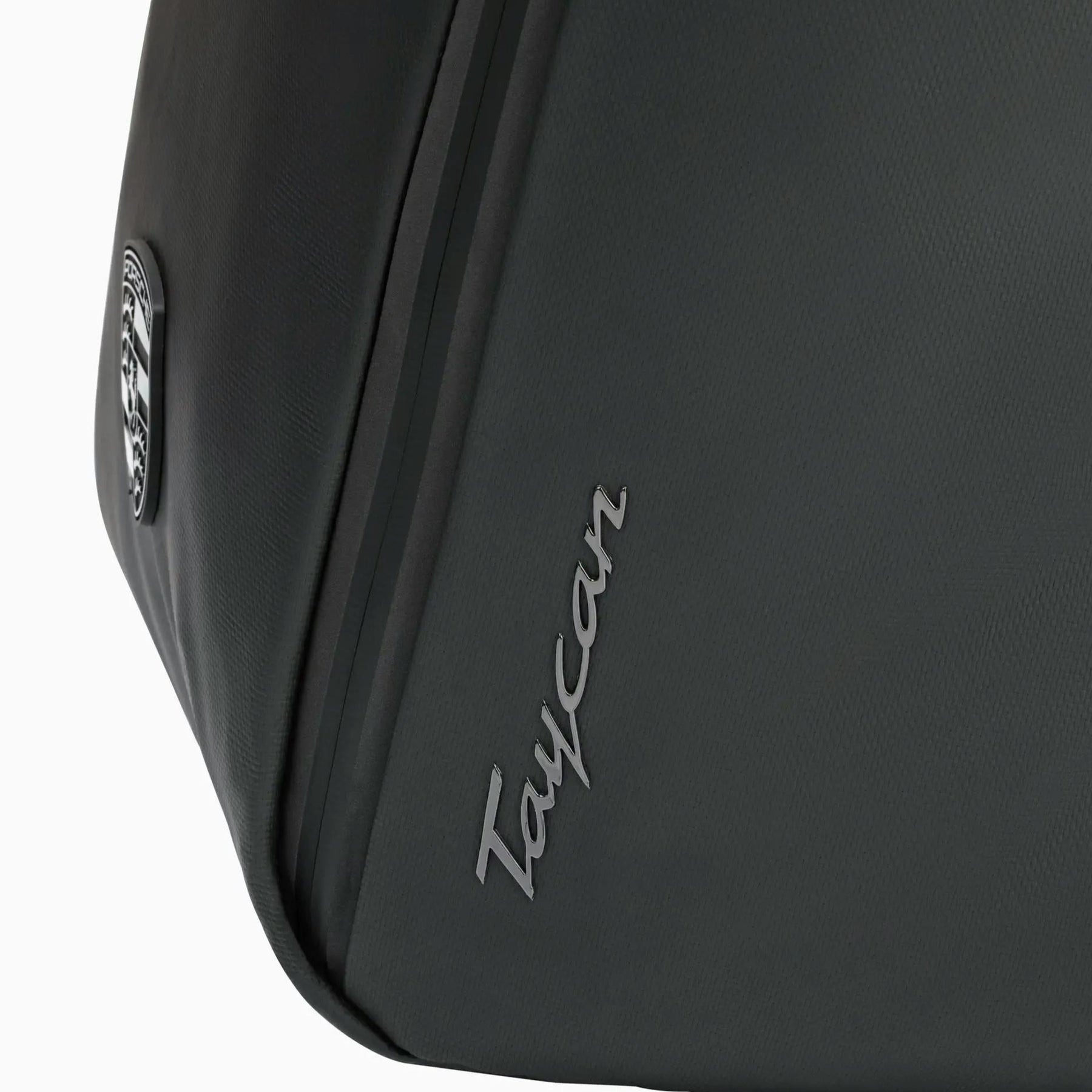 Spacious Porsche roll-top backpack with 'Taycan' logo on the side and functional notebook compartment.