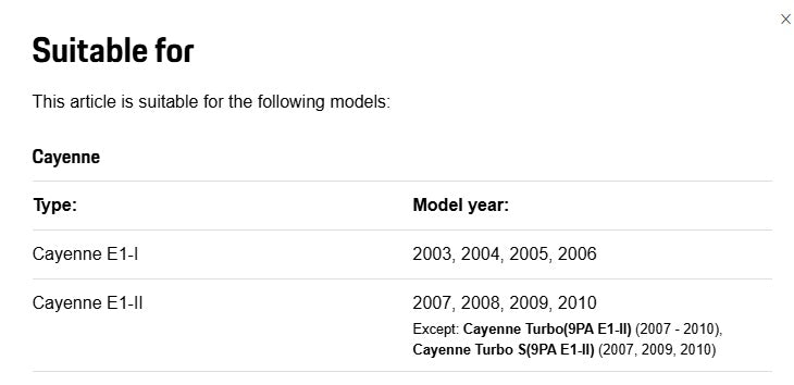 Suitable for the Cayenne from 2003-2010. Not suitable for the Cayenne Turbo/Turbo S from 2009-2010 and for cars with PCCB.