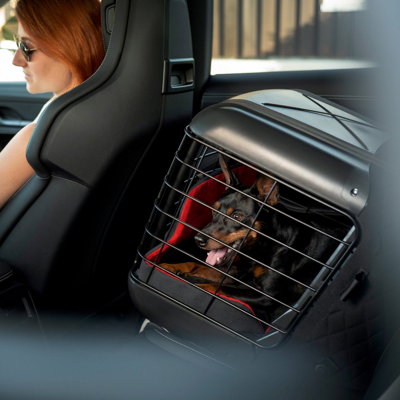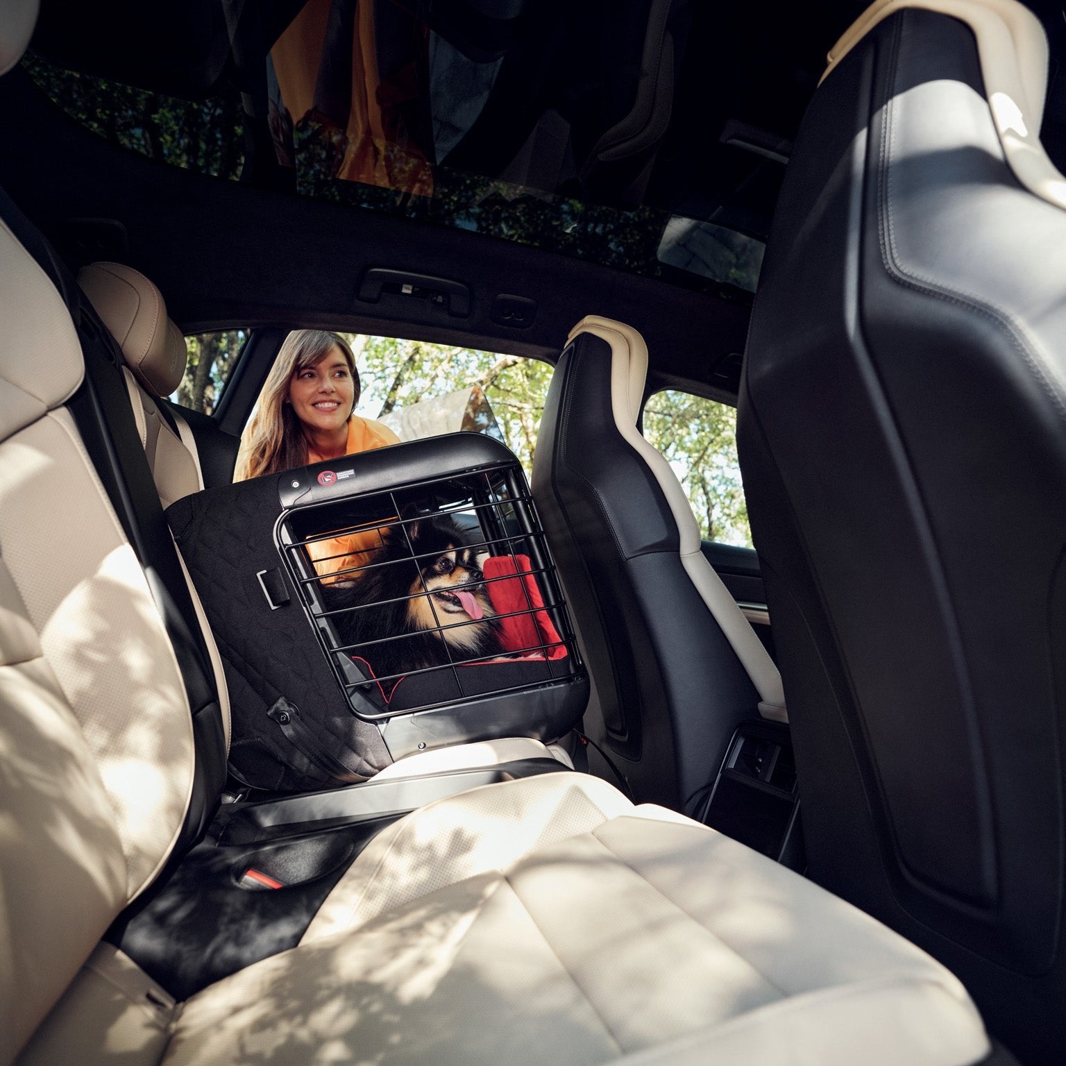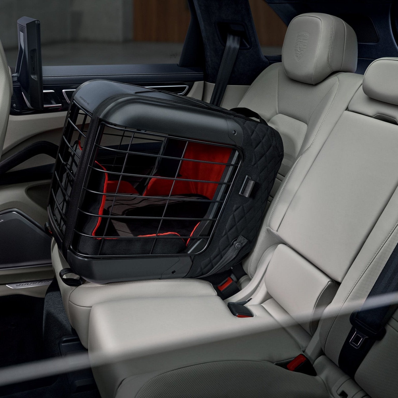 The Porsche dog carrier allows four-legged passengers to be transported safely and easily inside the vehicle.