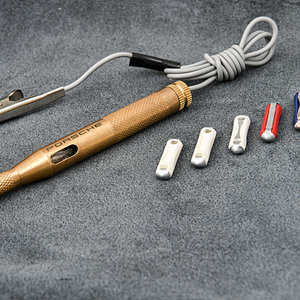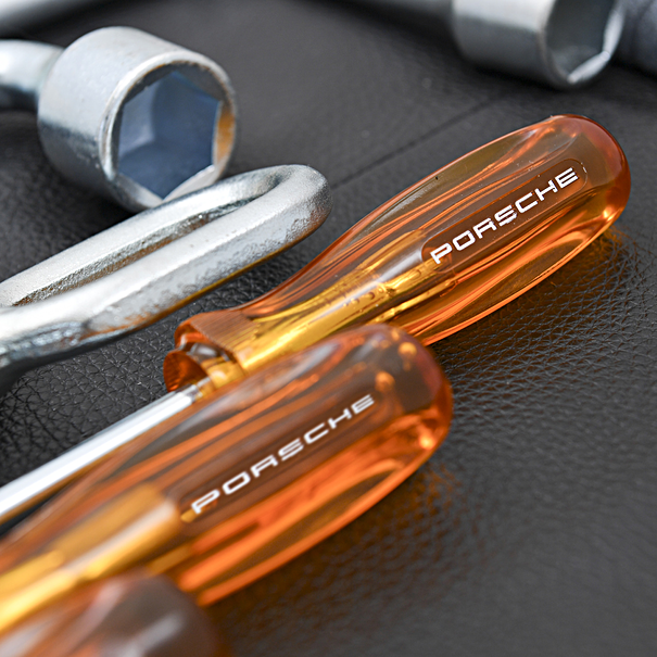 Porsche Classic has redesigned this tool bag, producing a new edition with a spectacular look in the style of the late 1970s. Whereas the original featured only artificial leather, the new tool bag is made of real black leather and red tartan fabric. The design of the fabric is based on a typical seat cover from this era. Following on from the development of a tool bag for the 911 F model, the range now includes a tool bag for the subsequent 911 models. These vehicles boast special features, such as the towing lug, which comes complete with brief instructions and is designed as a bayonet hook allowing it to attach to the original trailer, which was fitted with a simplex hook. All tools have specified slots in this new bag as well. The screwdriver handles are made of yellow plastic just as before, but now also feature Porsche lettering. To make handling easier, Porsche Classic has replaced the original spark plug tool with a ratchet that features a special spark plug socket wrench and is much more practical to operate.