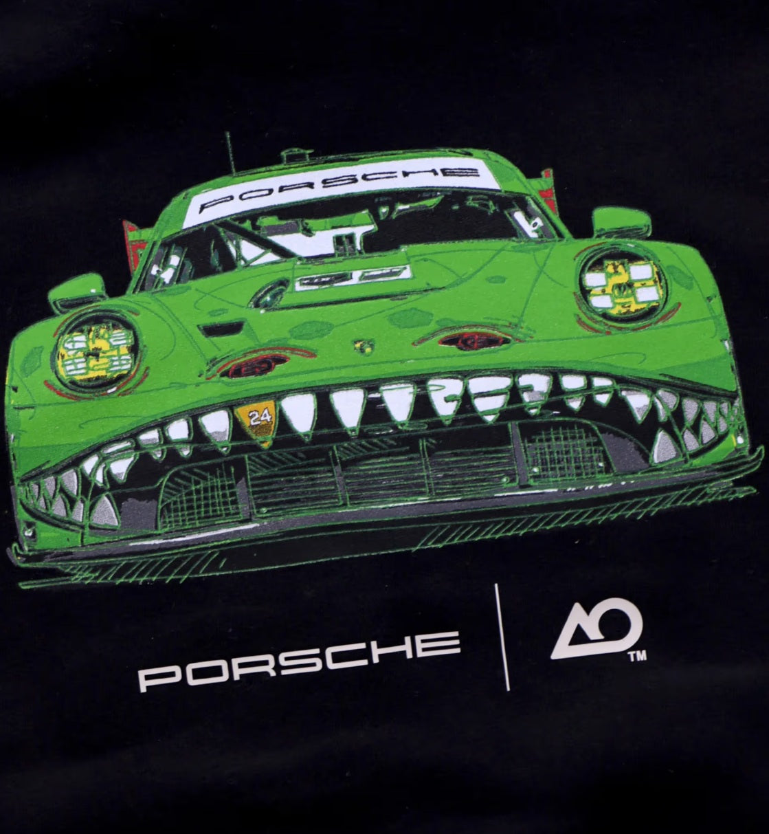 Porsche and AO Racing have teamed up to create a cool capsule collection that celebrates high-performance motorsport and bold fan culture. The inspiration: AO Racing’s IMSA championship winning Porsche 911 GT3 R, dubbed “Rexy” for its green dinosaur-themed livery, one of the most popular cars on the endurance grid. The hoodie features a sketched version of AO's Rexy race car on the back and a playful Rexy dinosaur on the front.