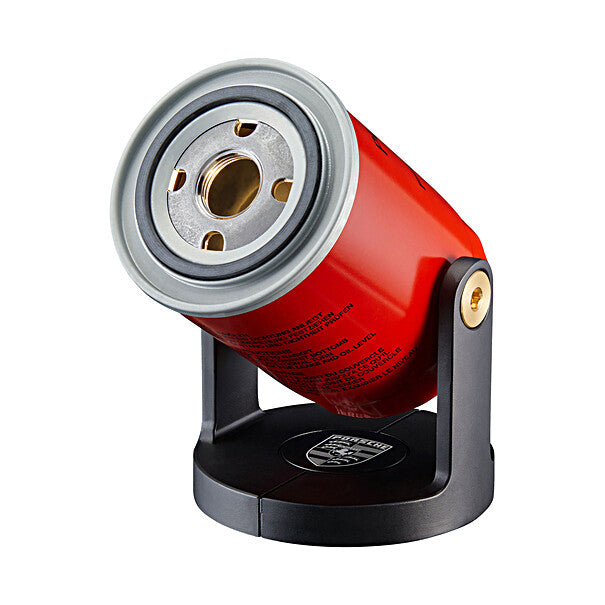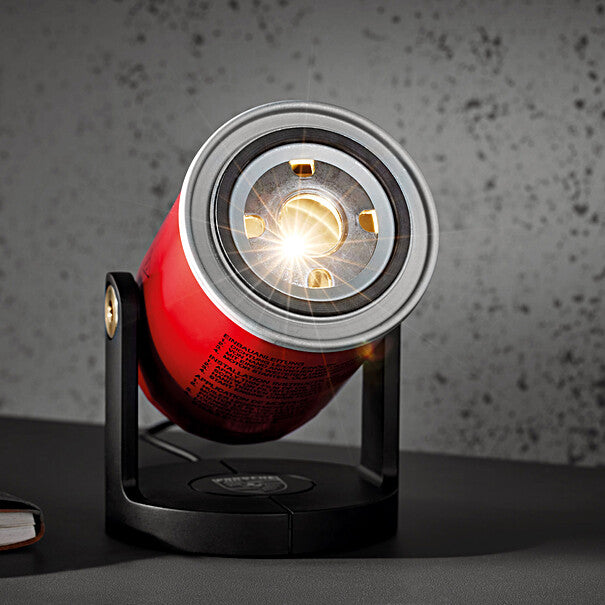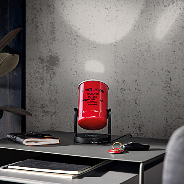 Spot on! The exclusive 911 spotlight not only illuminates the darkness, but is also a highlight in the home thanks to its exclusive design. The spotlight is made from the original red oil filter of the classic Porsche 911. It can be switched on and off with the touch function in the base. LED with 3,500 Kelvin and 160 lumens.