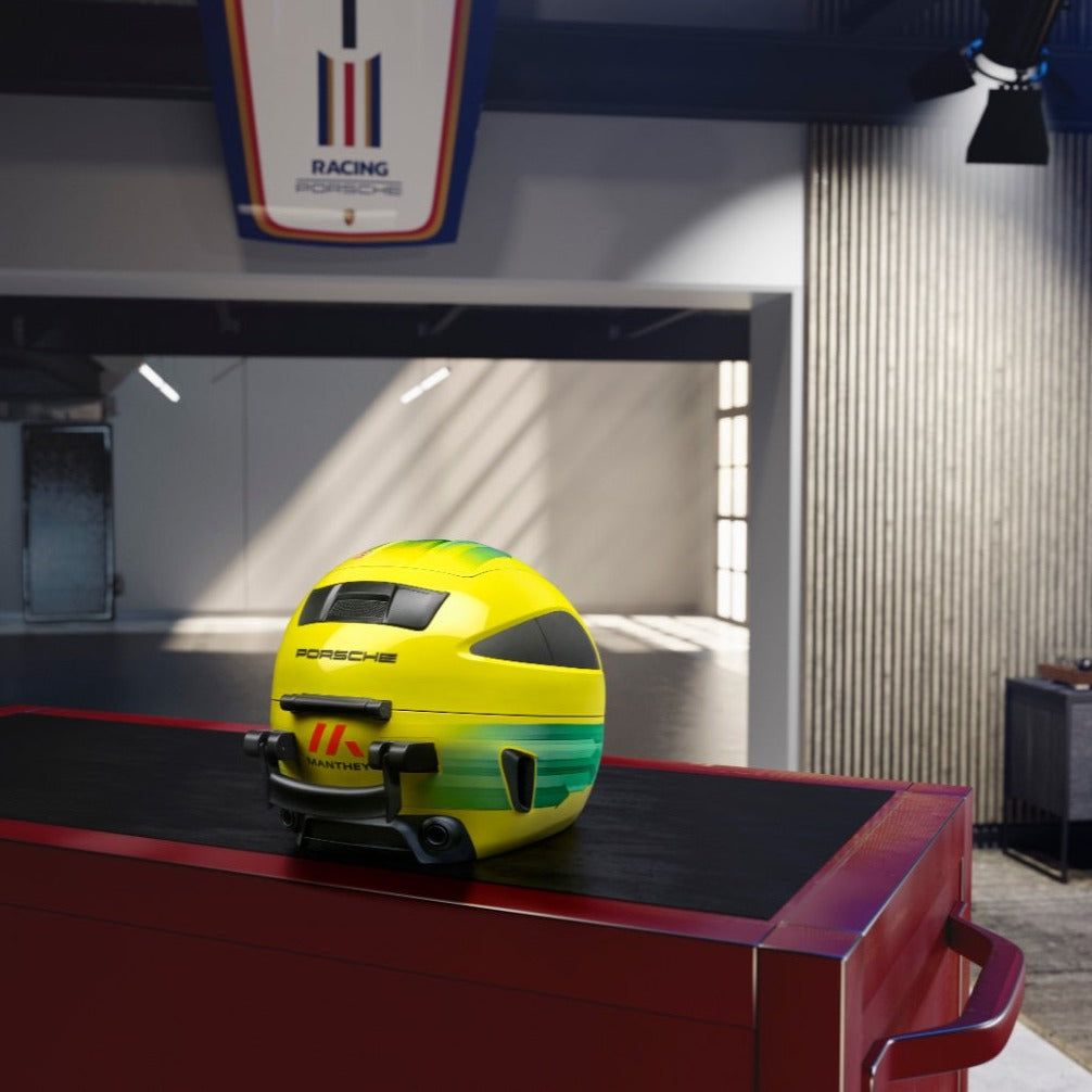 The design of the Helmcase is based on the legendary green and yellow Porsche GT3 R from Manthey. This is also known by Nürburgring long-distance fans as “Grello” due to its conspicuous film – a creation of words from “green” and “yellow”.