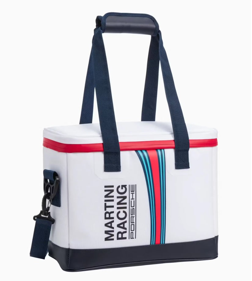 The cool bag from the MARTINI RACING® Collection features the design of the 911 SC Safari from 1978 and reliably keeps food of all kinds fresh on the go. Thanks to the two-handle carrier and adjustable shoulder strap, it can be transported extremely flexibly. Its compact, rectangular shape offers enough storage space for various containers and is easily accessible through the large opening with a zip. When the cool bag is empty, you can easily fold it up stow it away to save space.