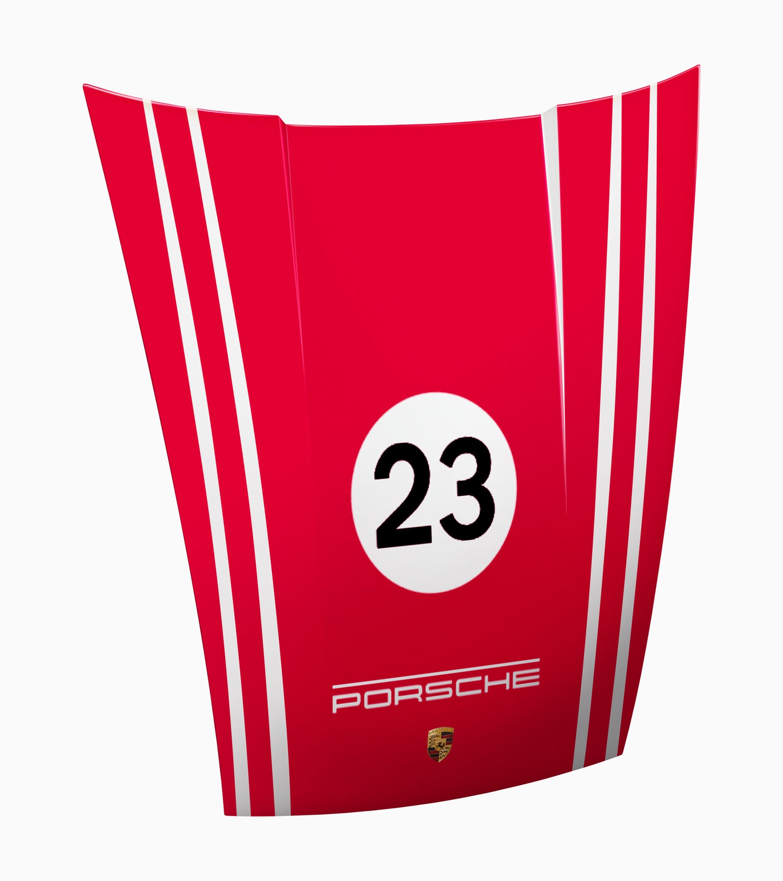 A piece of Porsche history – for your home. The original front hood of the historic Porsche 911 (G-model) in white with a foil decal in popular Motorsport finishes, as well as an original historic Porsche crest, is not just an impressive decoration, but also a stylish magnetic wall.