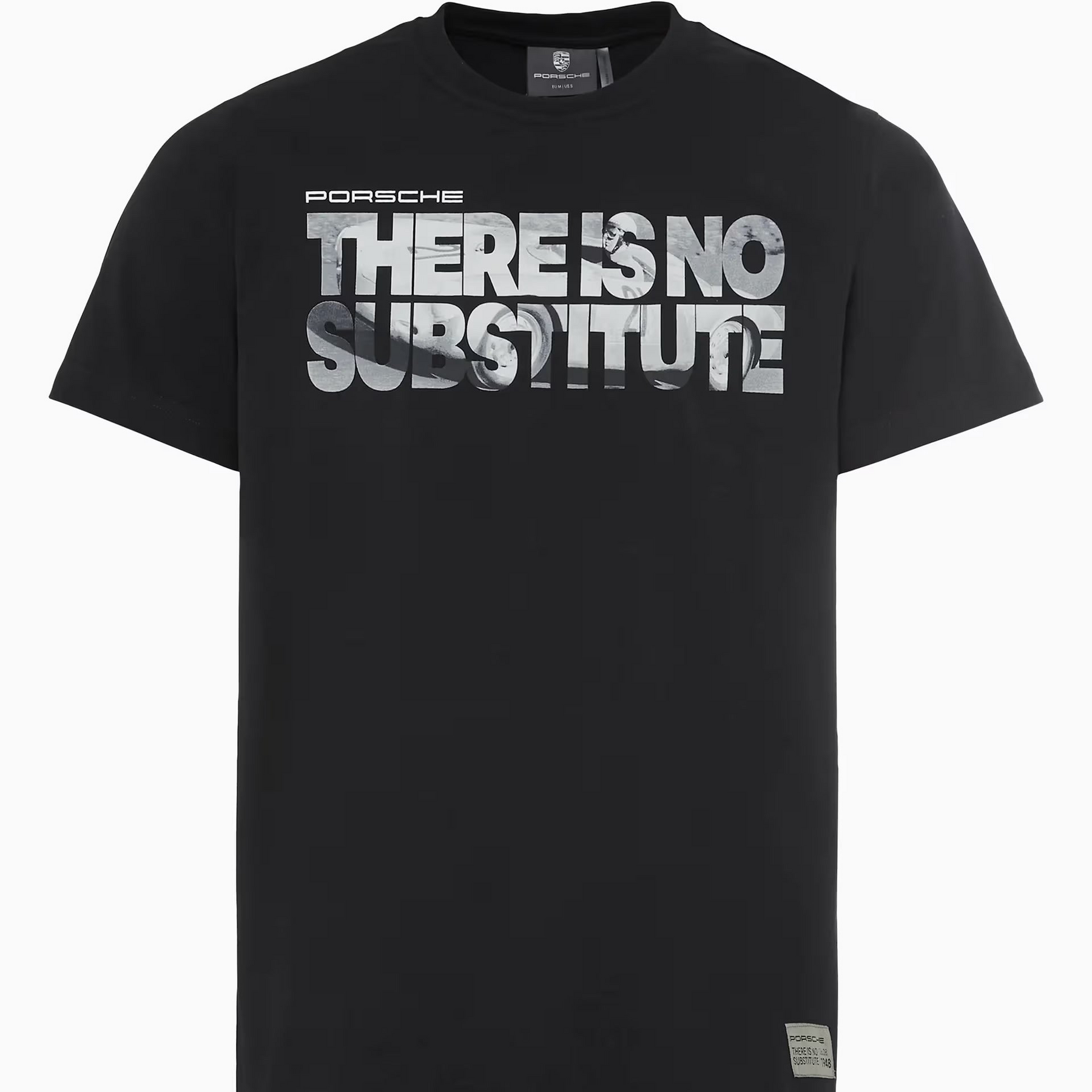 - Short-sleeved t-shirt with "Porsche. There Is No Substitute" print on the back and small - - - - Porsche logo type on the front.