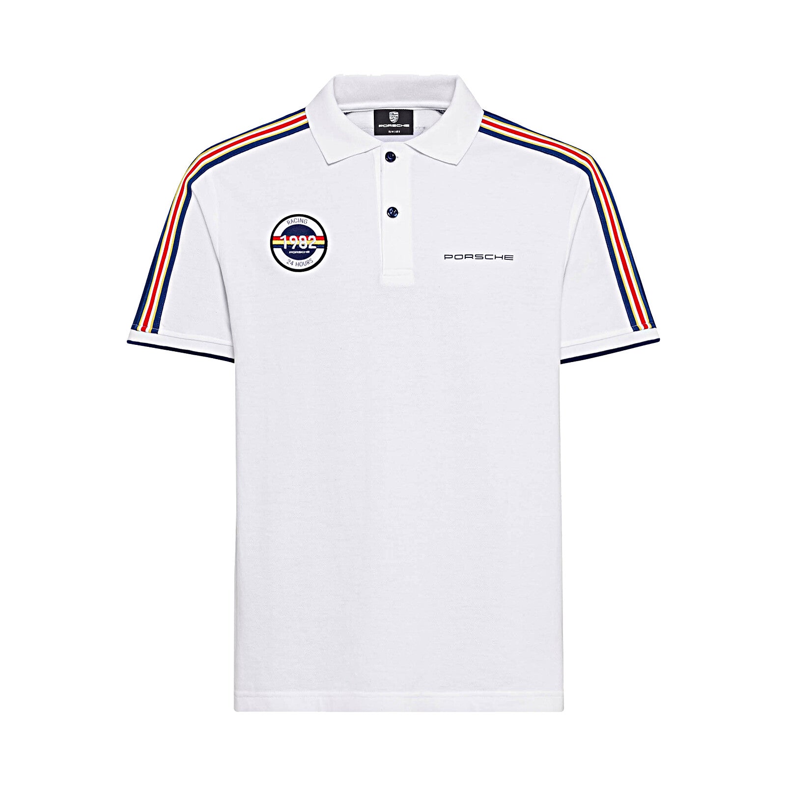 Polo shirt for men from the Porsche Racing collection. This collection is inspired by the Porsche 956 Rothmans, the 24 Hours of Le Mans winner in 1982. The polo features badges and print design inspired by Porsche 956 Rothmans. The shoulders and upper arm are decorated in blue with Rothmans stripes and colors.