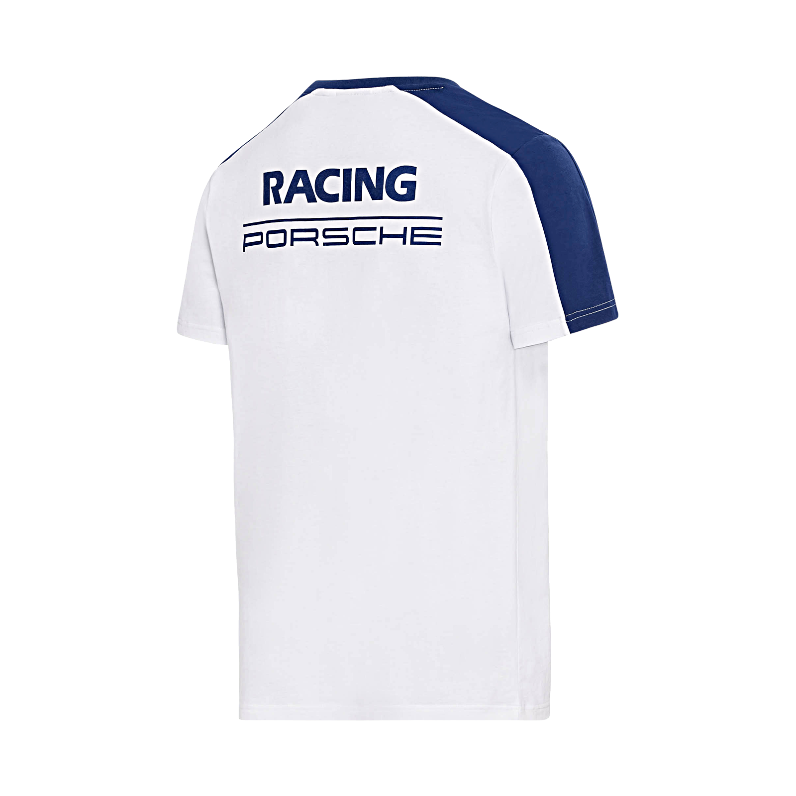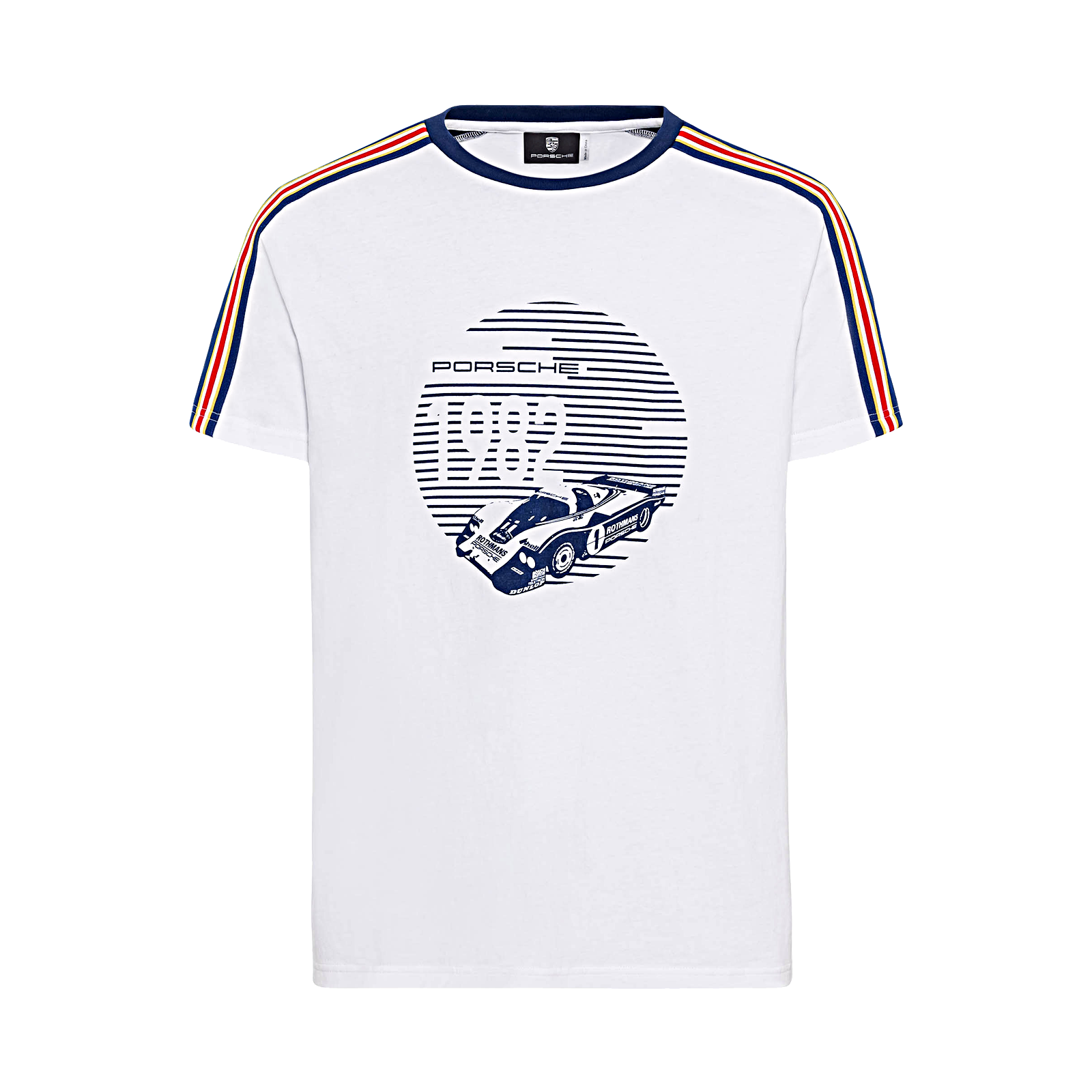 T-shirt for men from the Porsche Racing collection. This collection is inspired by the Porsche 956 Rothmans, the 24 Hours of Le Mans winner in 1982. The T-shirt features badges and print design inspired by Porsche 956 Rothmans. The shoulders and upper arm are decorated in blue with Rothmans stripes and colors.