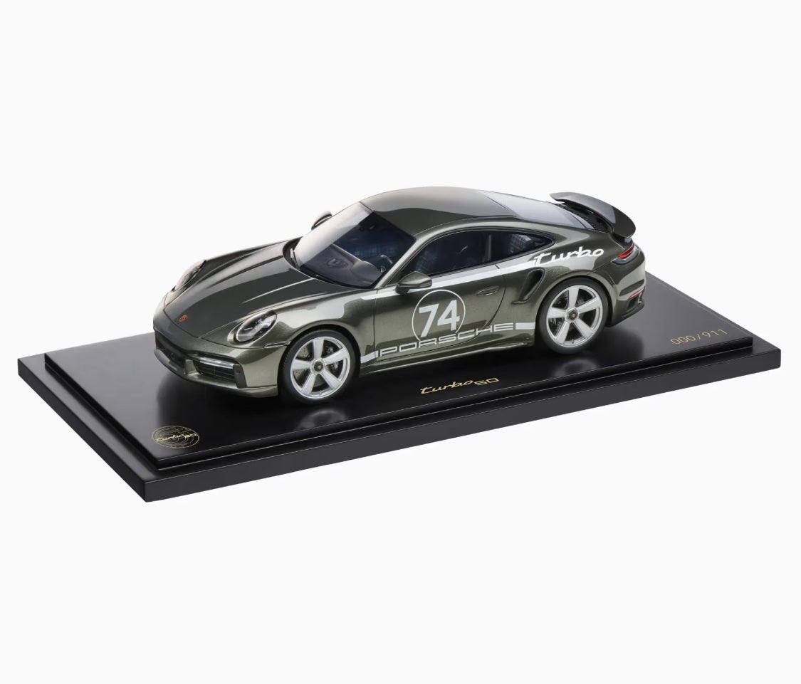 The exclusive 1:18 scale model of the Porsche 911 Turbo 50 (992) with Heritage Design Package showcases impressive attention to detail and deserves its place in any collection. The packaging also makes it the perfect gift for all Porsche fans. Made of resin. Aventurine Green exterior, Black interior.