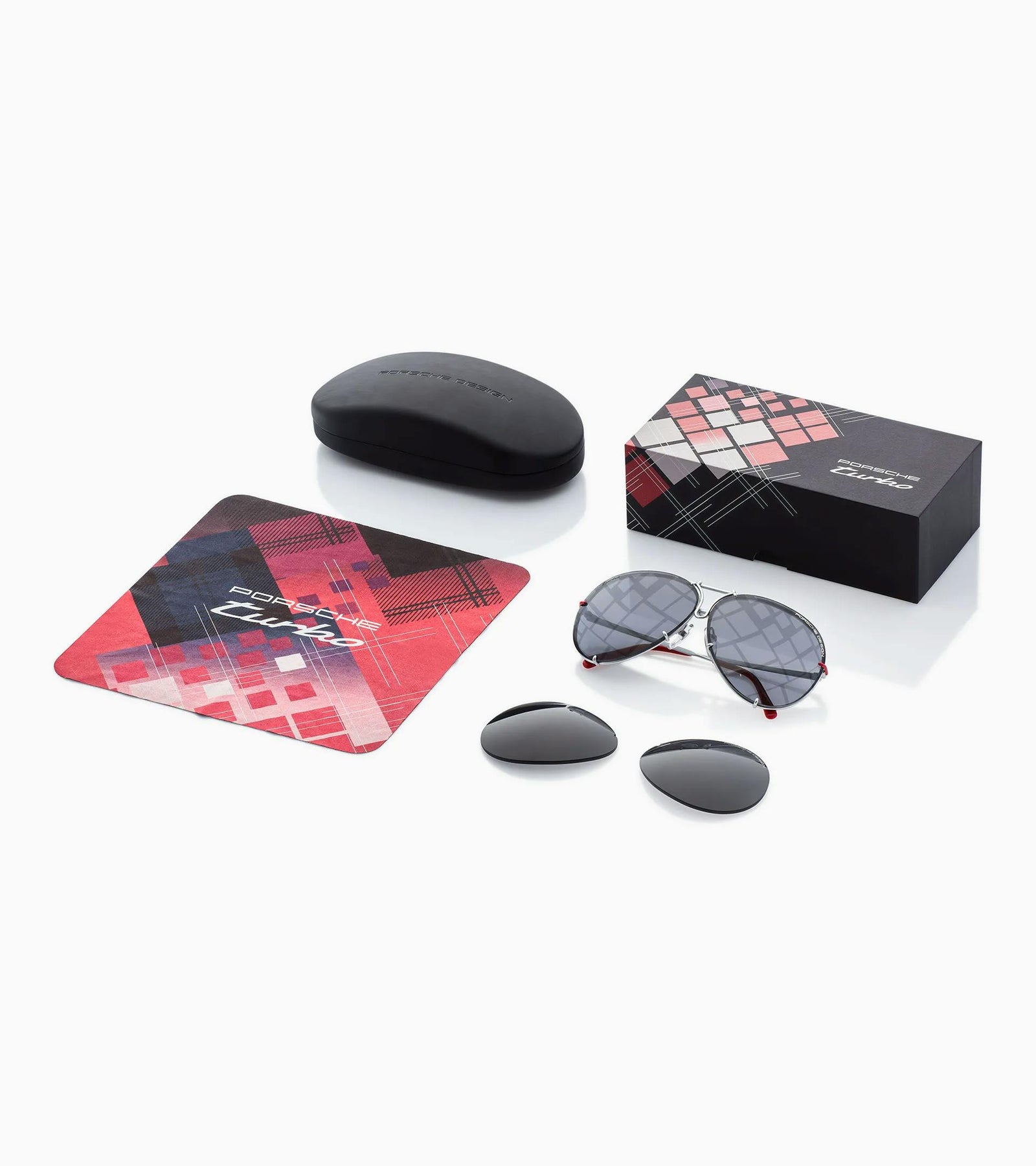 With this version of the P'8478 Turbo No. 1, Porsche Design is delivering a very special model as a tribute to the Porsche 911 Turbo for its 50th anniversary. Both the original paint colour of the vehicle and the legendary chequered pattern have been incorporated into the design of these iconic Porsche Design sunglasses with the innovative interchangeable lens mechanism. Both pairs of lenses and the left temple feature the Porsche Design logo. On top, the detailed look of the limited edition is underlined by subtle Turbo branding on the left lenses. Extremely lightweight titanium and durable coated lenses made of scratch-resistant and virtually unbreakable polycarbonate ensure that the Porsche Design 'exclusive sunglasses' not only enjoy an impressive innovative design but also maximum functionality. The iconic Porsche Design Sunglasses P'8478 are the first sunglasses in the world to feature an interchangeable lens mechanism: the teardrop-shaped 6-base curve lenses with Vision Drive technologyTM can be easily exchanged with interchangeable lenses using a quick-release system, allowing them to be adapted to different lighting conditions and styles. Each pair of sunglasses in this special collection comes in a high-quality Turbo No. 1 gift box with a special Turbo No. 1 lens cleaning cloth. Laser-engraved limited edition number on the frame, limited to 1,974 units worldwide, based on the anniversary year 1974.