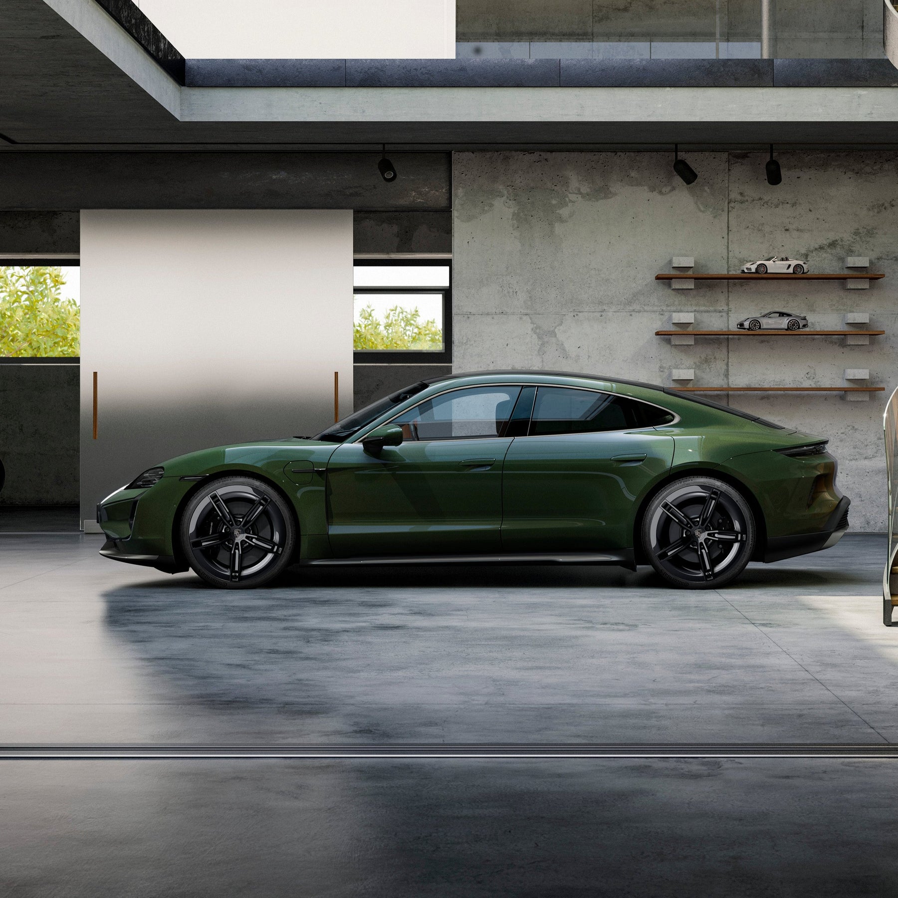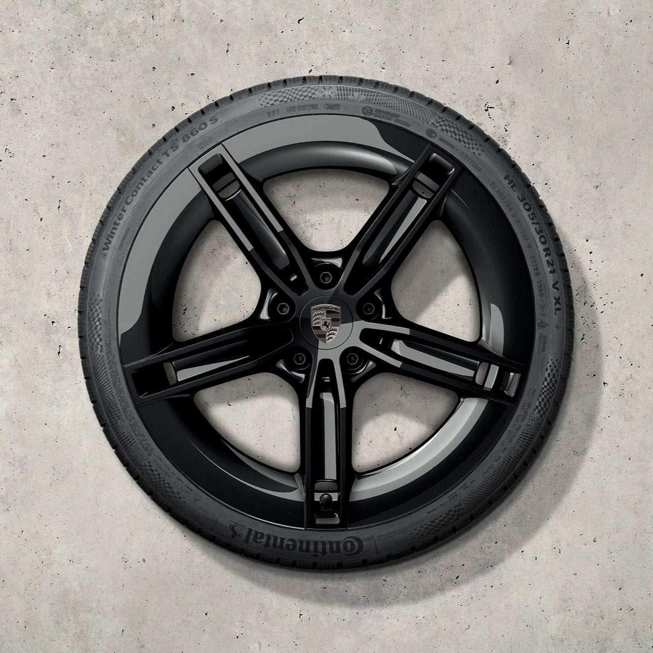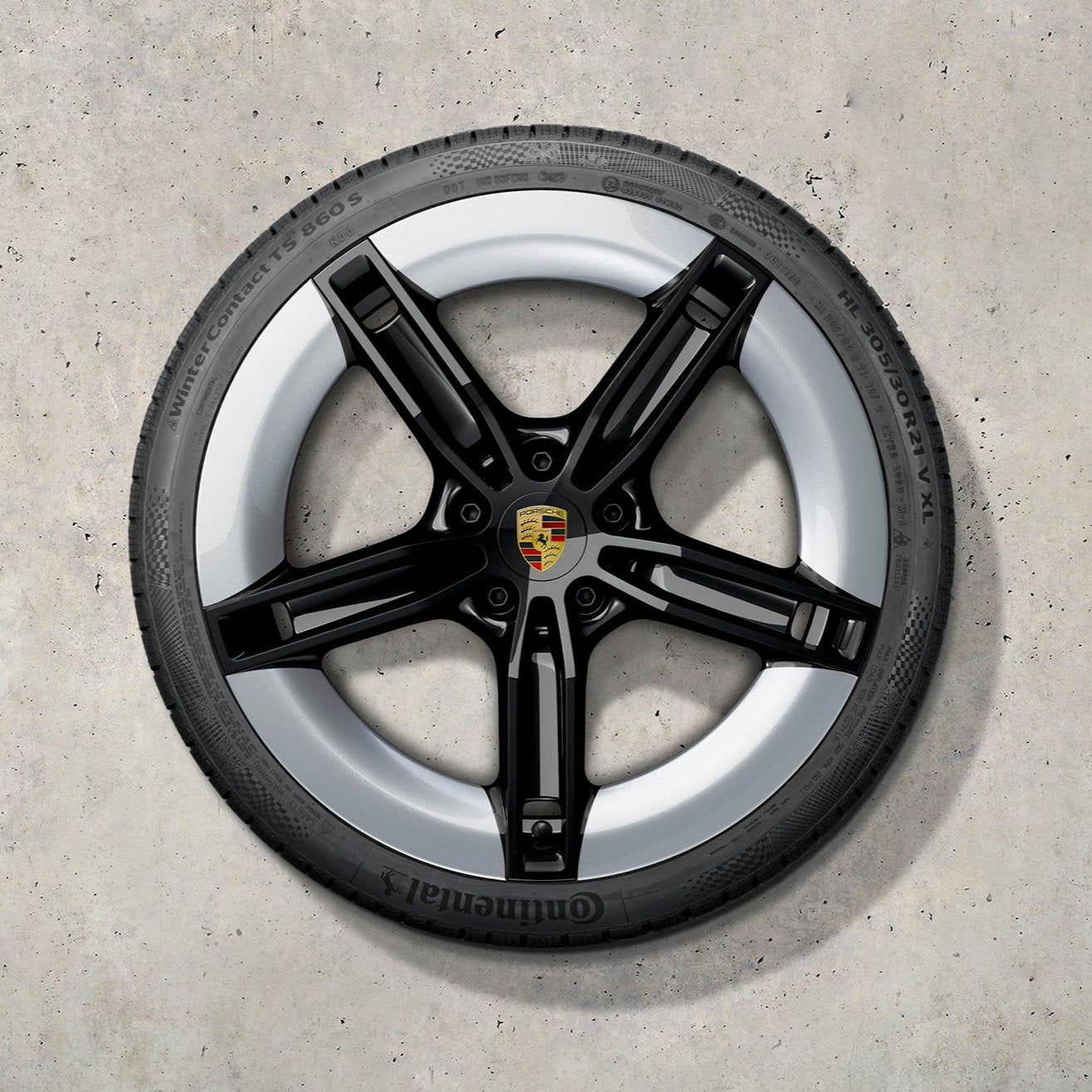 Forged wheels in 5-spoke design and bi-color look in Brilliant-Silver/Black (high-gloss) based on the design of the Porsche Mission E concept study.