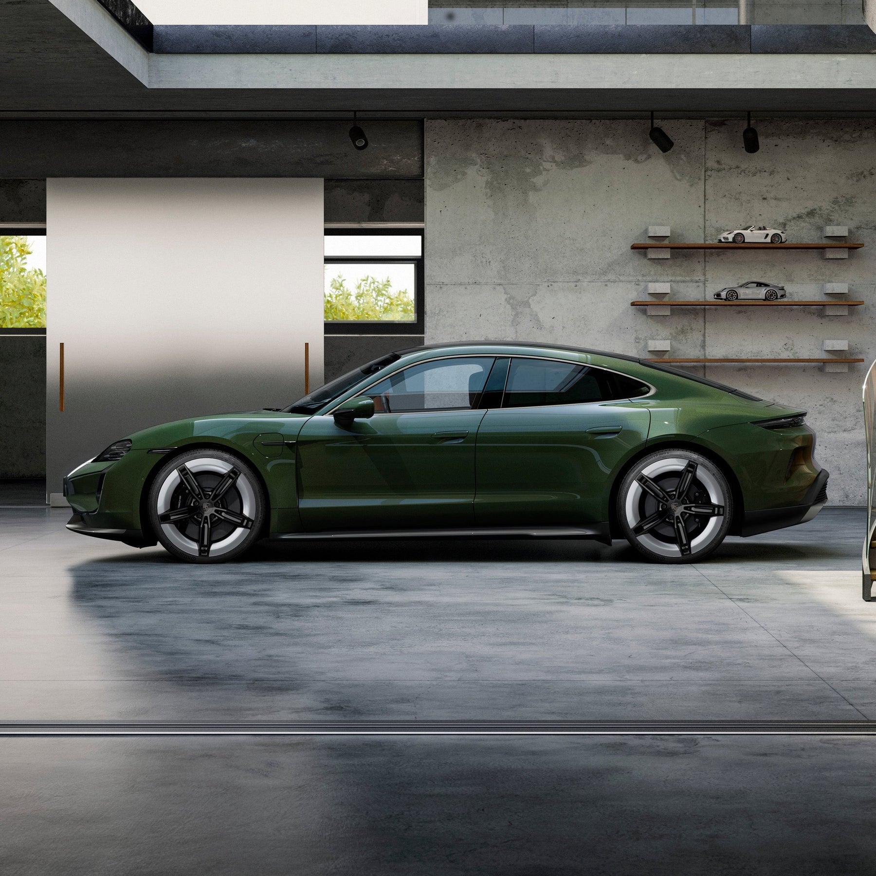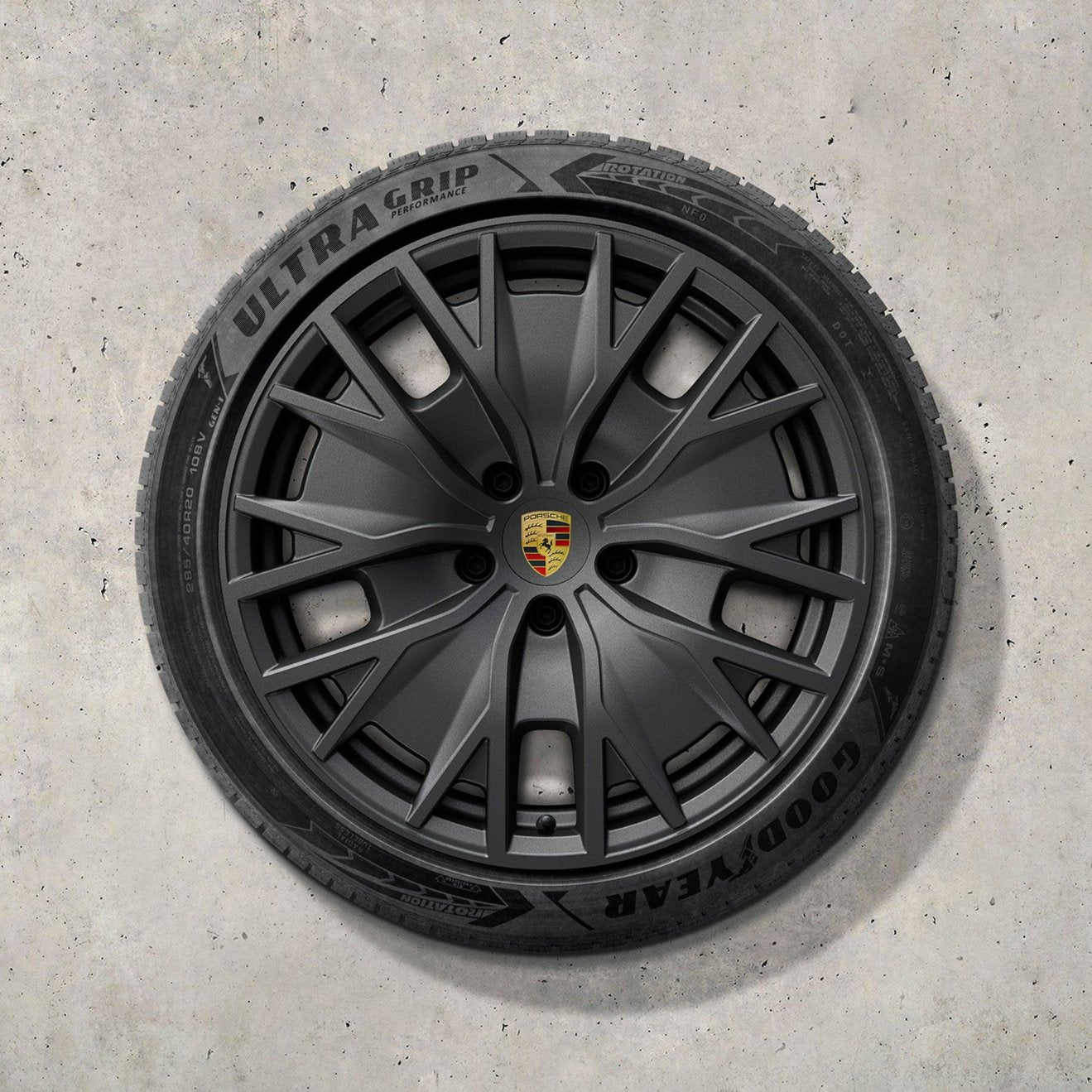 Forged wheels in 5-spoke design and bi-color look in Brilliant-Silver/Black (high-gloss) based on the design of the Porsche Mission E concept study.