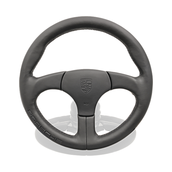 3-spoke steering wheel without airbag, with stitching in Guards Red and Porsche logo on the black leather-covered steering wheel rim; suitable for Porsche 911 from 1974-1989 and Porsche 959 from 1987-1988. Diameter: 360mm.