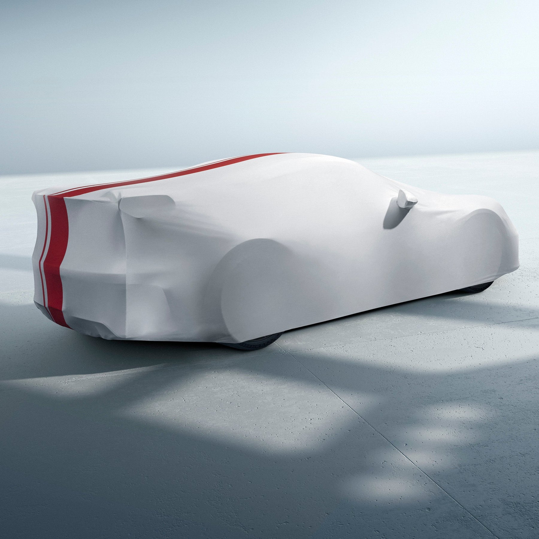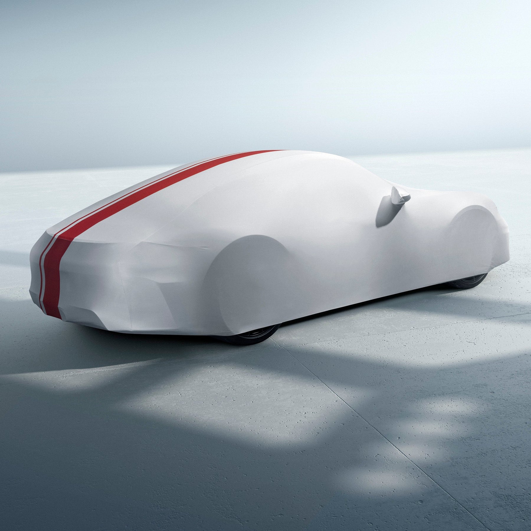 Custom-fit white indoor vehicle cover made of breathable, antistatic and dirt-repellent material. In 911 GT3 design with red decorative stripes, including practical carrying bag.