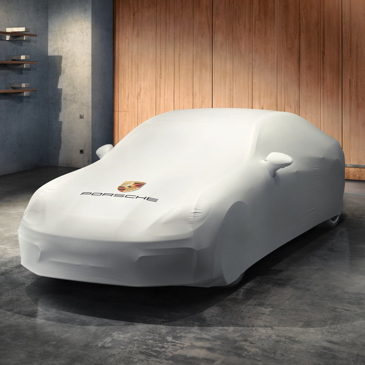 Custom-fit indoor vehicle cover made from breathable, antistatic and dirt-repellent material. With colored Porsche Crest and "PORSCHE" logo.