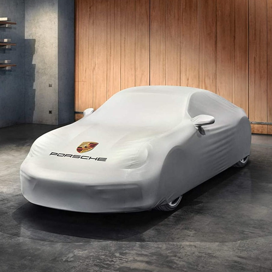 Custom-fit outdoor vehicle cover made of water-repellent material with a colored Porsche Crest and PORSCHE logo. Anti-theft protection included.
