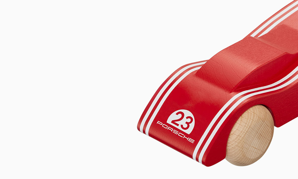 Wooden toy vehicle. Shape and color based on the legendary Porsche 917 Salzburg.