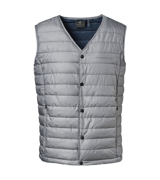 Lightly padded quilted gilet with press studs, two side pockets and V-neck. Ideal for travel: the gilet can be folded into a pillow. With ‘PORSCHE’ logo on the chest.