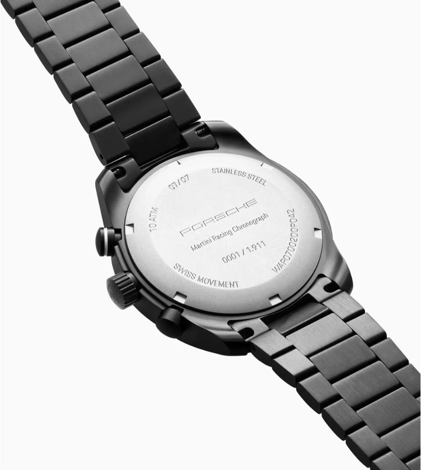 The chronograph from the MARTINI RACING® Collection was designed by Studio FA Porsche. It is limited to 1,911 pieces – the respective limited-edition number is engraved on the back of the case. Contemporary features win the race: from the RONDA analogue quartz movement and the Black case made of finely brushed stainless steel to the mineral glass with anti-reflection coating on one side and the sapphire coating. The chronograph has a date window (4 o'clock) and three totalisers with the functions: second counter (3 o'clock), chrono 30-minute counter (9 o'clock), chrono hour counter (6 o'clock). The Silver dial made of metal with MARTINI RACING® design and matt Black applied indices and the 'MADE IN GERMANY' lettering at 6 o'clock is a visual highlight. The screwed crown is adorned with an engraved Porsche crest. The 'PORSCHE' logo on the butterfly clasp of the Black stainless steel bracelet is also elaborately engraved. In short: refined details and the perfect combination of form and function make the MARTINI RACING® chronograph a real must-have for all racing fans.