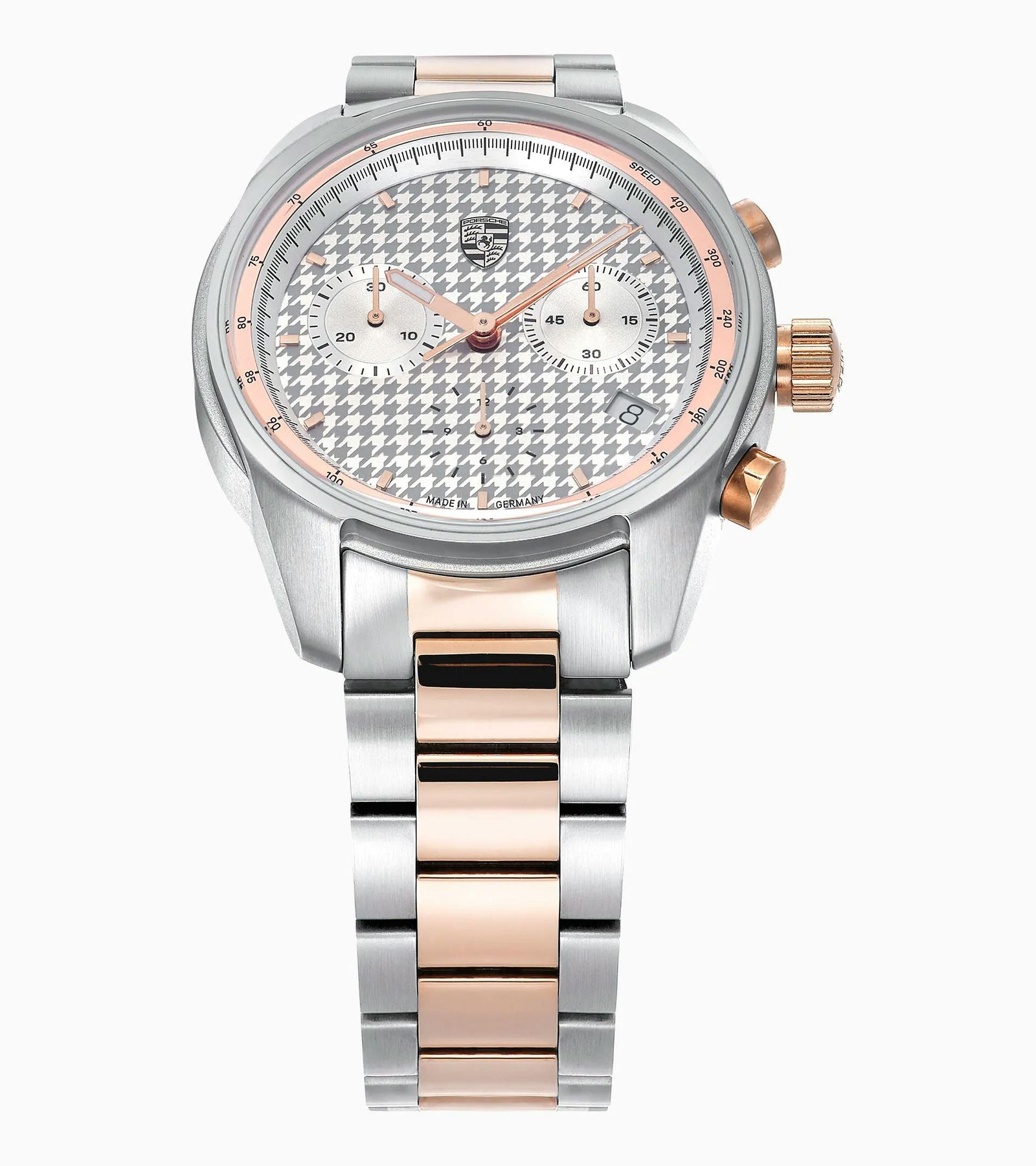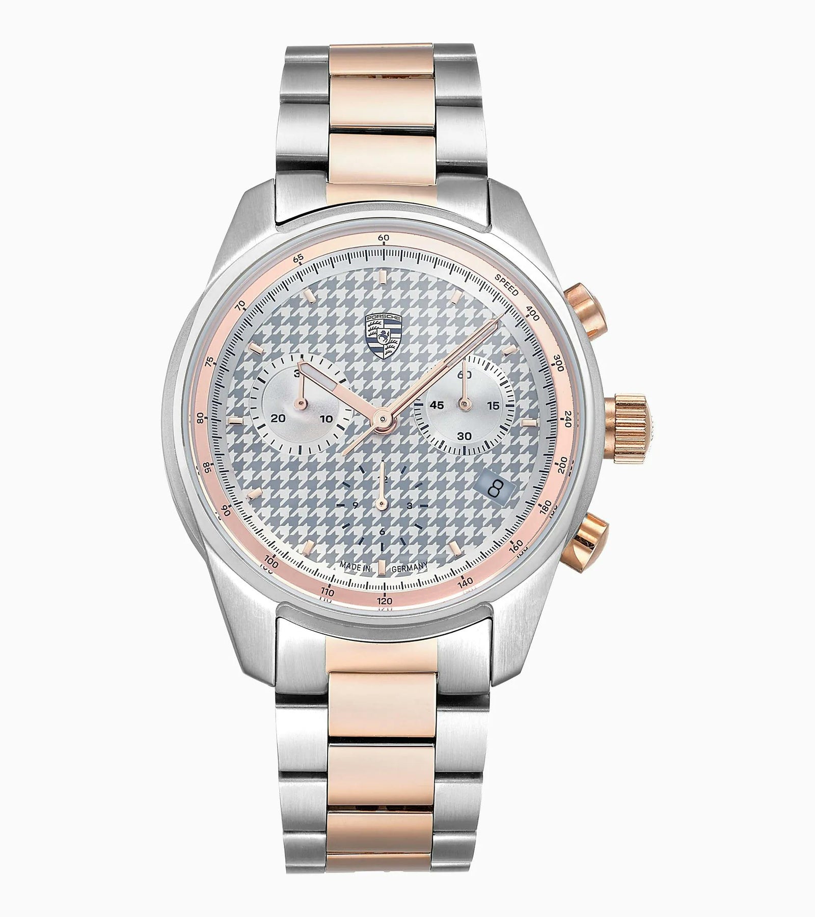 The chronograph from the exclusive Pepita Collection was designed by Studio F. A. Porsche. Contemporary features win the race: equipped with a RONDA analogue quartz movement and a case made of finely brushed stainless steel, the chronograph captivates with its polished crown and pushers with a rose gold coating as well as an engraved Porsche crest on the front face. The mineral glass with sapphire and anti-reflective coating protects the dial, which features a monochrome 3D print of the Pepita pattern and a Porsche crest. Super-LumiNova-coated hour and minute hands ensure optimal readability. In addition to the date window at 4 o'clock, the chronograph boasts three totalisers for comprehensive time measurement: second counter (3 o'clock), chrono 30-minute counter (9 o'clock), chrono hour counter (6 o'clock). The butterfly clasp – adorned with engraved Porsche lettering – and ‘Made in Germany’ lettering at 6 o’clock complete the exclusive appearance. In short: refined details and the perfect combination of form and function make the Pepita chronograph a real must-have for all racing fans.