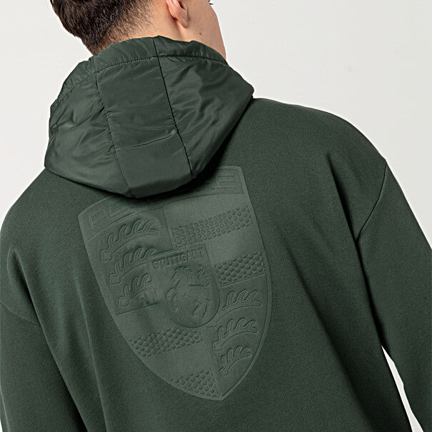 Minimalism meets elegance: the Essential Collection with a unique design that captures the Porsche spirit in its most refined form. The unisex cotton hoodie has a patch kangaroo pocket and a hood, which is given a special touch by the nylon material. Equipped with the Porsche lettering on the left chest and the large Porsche emblem embossed on the back, it makes a real statement piece.