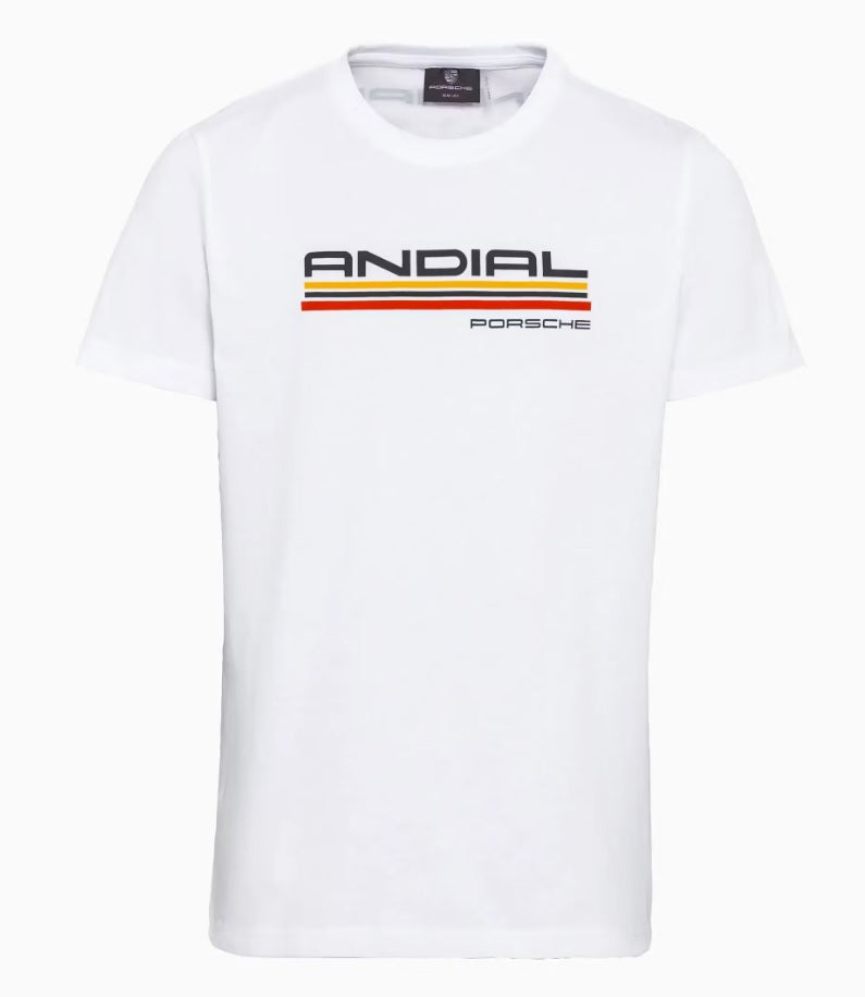 Celebrating ANDIAL, a staple of Porsche racing history, and the iconic 935-L ‘Moby Dick’ race car from the 80’s. White short sleeve t-shirt with colored ANDIAL print on the front and back.